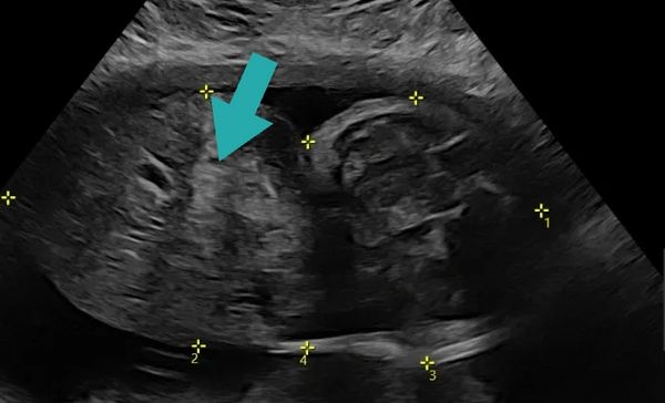 (Pic: fetal ultrasound with arrow demonstrating a giant omphalocele)